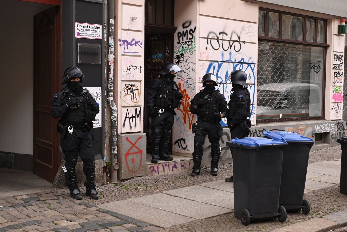 - Mehrere vermummte Beamte bewachen einen Hauseingang an der Wolfgang-Heinze-Straße.