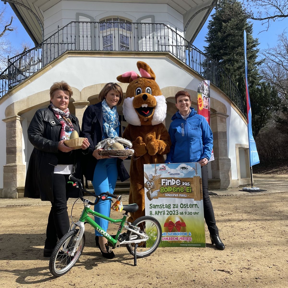 - V.l.n.r.: Manuela Stengel (WBG Zwickau-Land), Diana Hübner (ZWG) und Kathleen Uhlig (Wewobau) haben die Ostereiersuche diese Woche im Schlosspark angekündigt.