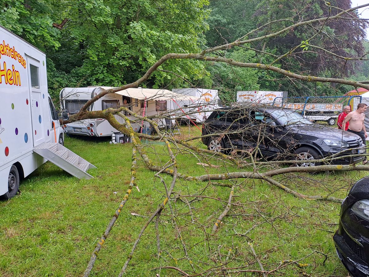 Baum fällt nach Starkregen auf Wohnmobil und Autos von Zirkus