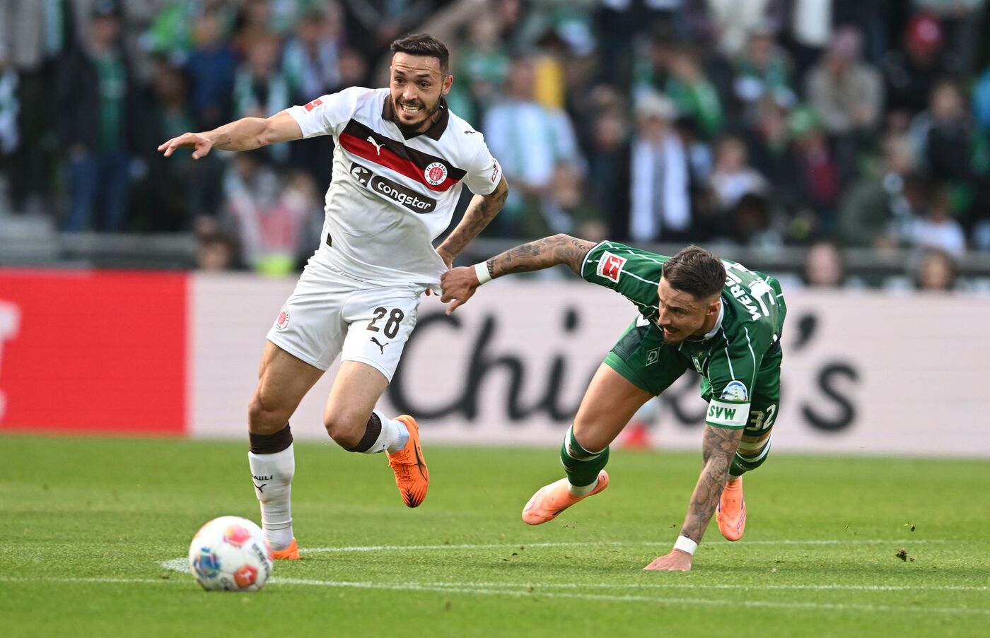 - Hier geblieben: Werders Marco Friedl (r) verfolgt St. Paulis Mathias Pereira Lage.