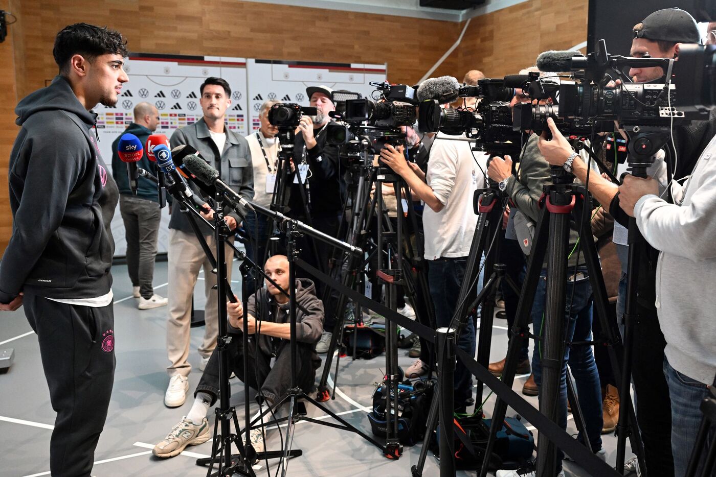 - Bayern-Profi Aleksandar Pavlovic beantwortet im DFB-Quartier Reporterfragen.