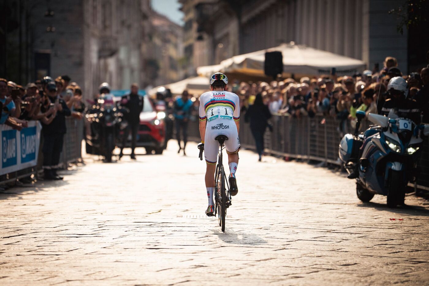 Pogacar setzte 36 Kilometer vor dem Ziel am Passo di Ganda zu seiner entscheidenden Attacke an. Evenepoel konnte wie zuletzt bei der WM und EM dem Tour-de-France-Champion nicht mehr folgen. Nachdem Pogacar den amerikanischen Ausreißer Quinn Simmons 34 Kilometer vor dem Ziel ein- und überholt hatte, fuhr er in gewohnter Manier alleine dem Sieg entgegen.