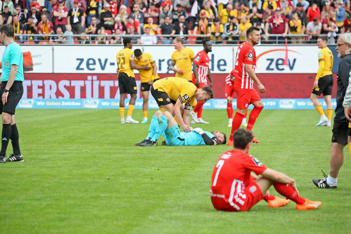 Der Abstieg des FSV Zwickau ist durch die 0:1 Niederlage im Sachsen-Derby besiegelt worden. Vor 10 134 Zuschauern im erstmals in einem Punktspiel komplett ausverkauften GGZ-Stadion war Dresdens Niklas Hauptmann (34. Minute) Schütze des einzigen Treffers. Die Partie begann mit zwölfminütiger Verspätung, nachdem die Dresdner Fans ein Stadiondach besetzt und von dort aus eine Choreografie gestartet hatten.