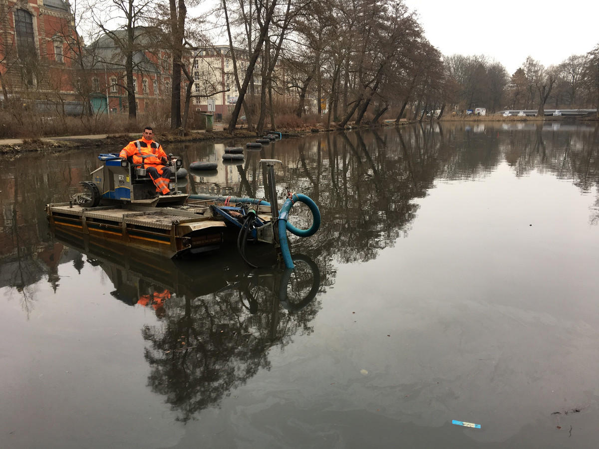 - Damit es mit dem unangenehmen Geruch ein Ende hat - der Schwimmbagger holt tonnenweise Schlamm aus dem Langen Teich.