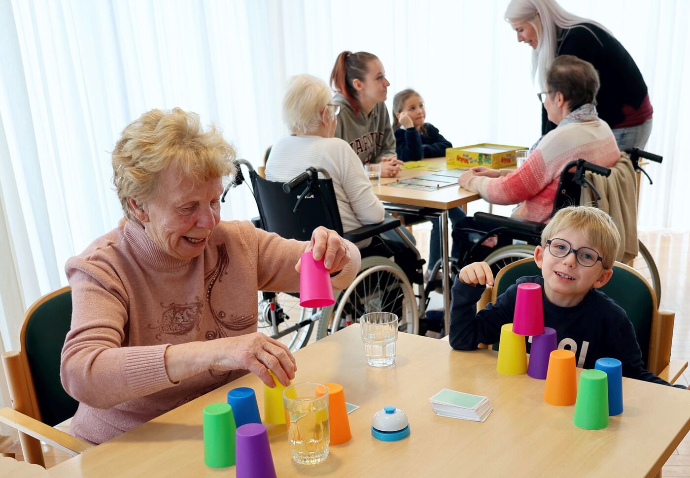 - Kinder und Pflegeheimbewohner beschäftigen sich gern miteinander.
