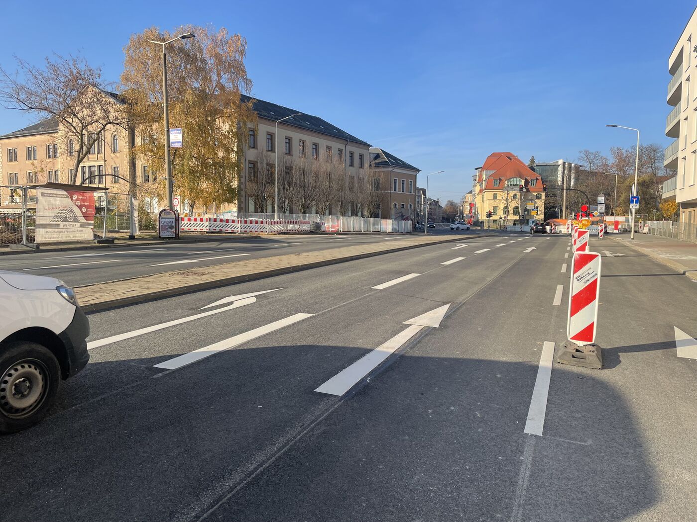 Zuletzt hatten Regentage die Markierungsarbeiten verzögert. Doch mit der Freigabe Anfang November lag das Vorhaben im Zeitplan. Die Kreuzung ist nun barrierefrei, darunter liegen neue Leitungen der Wasserwerke und der ZEV, und die angrenzenden Abschnitte der Crimmitschauer Straße und der Humboldtstraße haben eine frische Fahrbahndecke.