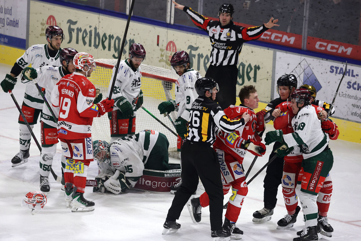 Die Tore für Crimmitschau erzielten Felix Thomas in der siebten und Maxim Trépanier in der 22. Minute. Im Schlussdrittel sorgte Charlie Sarault jedoch früh für die erneute Führung der Gäste.