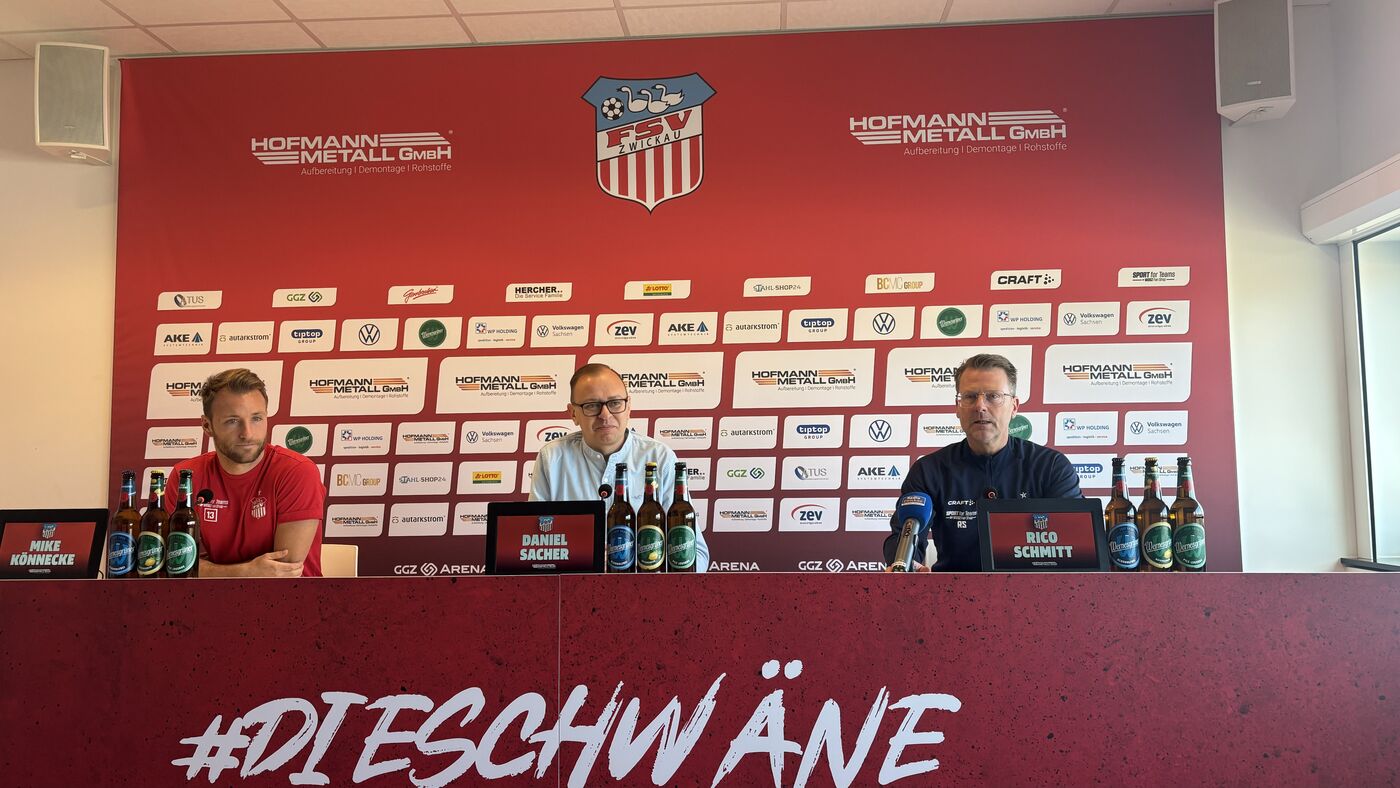 - (v.l.) FSV-Kapitän Mike Könnecke, Pressesprecher Daniel Sacher und Cheftrainer Rico Schmitt
