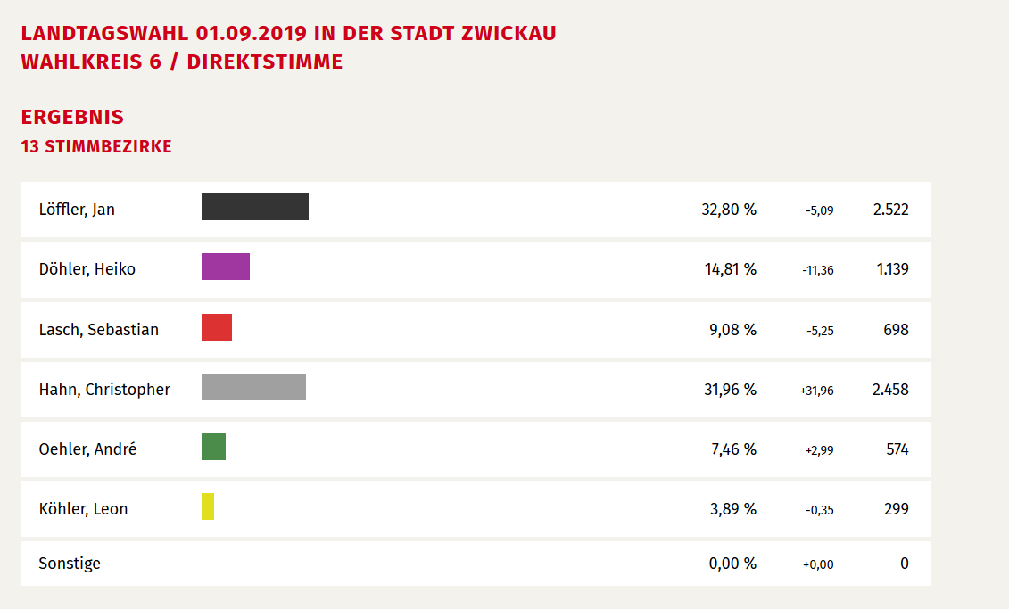 Im Wahlkreis 6 hat Jan Löffler von der CDU in Zwickau sein Mandat verteidigt. Nach Auszählung aller 13 Stimmbezirke holte Löffler 32,80 Prozent der Direktstimmen. Für Christopher Hahn von der AfD stimmten 31,96 Prozent der Wahlberechtigten. Die Wahlbeteiligung lag bei knapp 59 Prozent. Weil zum Wahlkreis 6 u.a. auch Crimmitschau und Werdau gehören, ergibt sich für Löffler noch ein anderes Gesamtergebnis: 39,1 Prozent.