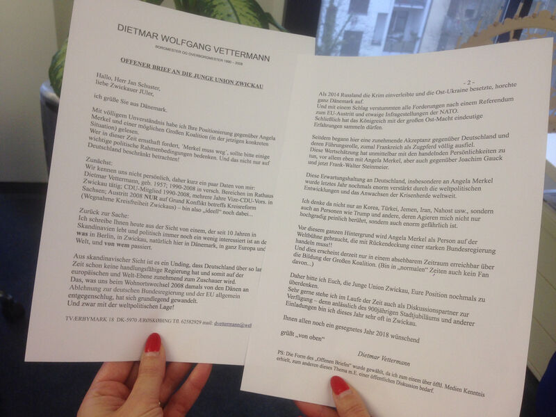 Die Junge Union in Zwickau hat Bundeskanzlerin Angela Merkel aufgefordert zurückzutreten. Dafür ist sie von der Landes-CDU scharf kritisiert worden. Jetzt hat sich Ex-Oberbürgermeister Dietmar Vettermann zu Wort gemeldet. In einem offenen Brief an den Zwickauer CDU-Nachwuchs und dessen Chef Jan Schuster schreibt Vettermann aus Dänemark, wo er seit zehn Jahren lebt, er habe überhaupt kein Verständnis für diese Positionierung. "Wer in dieser Zeit ernsthaft fordert, 'Merkel muss weg', sollte einige wichtige politische Rahmenbedingungen bedenken." Deutschlands Wertschätzung in Dänemark habe insbesondere mit Angela Merkel zu tun. Mit Blick auf die weltweiten Konflikte werde Merkel "als Person auf der Weltbühne gebraucht". Vettermann war selbst CDU-Mitglied, aus Protest gegen die Kreisreform 2008 aber aus der Partei ausgetreten.