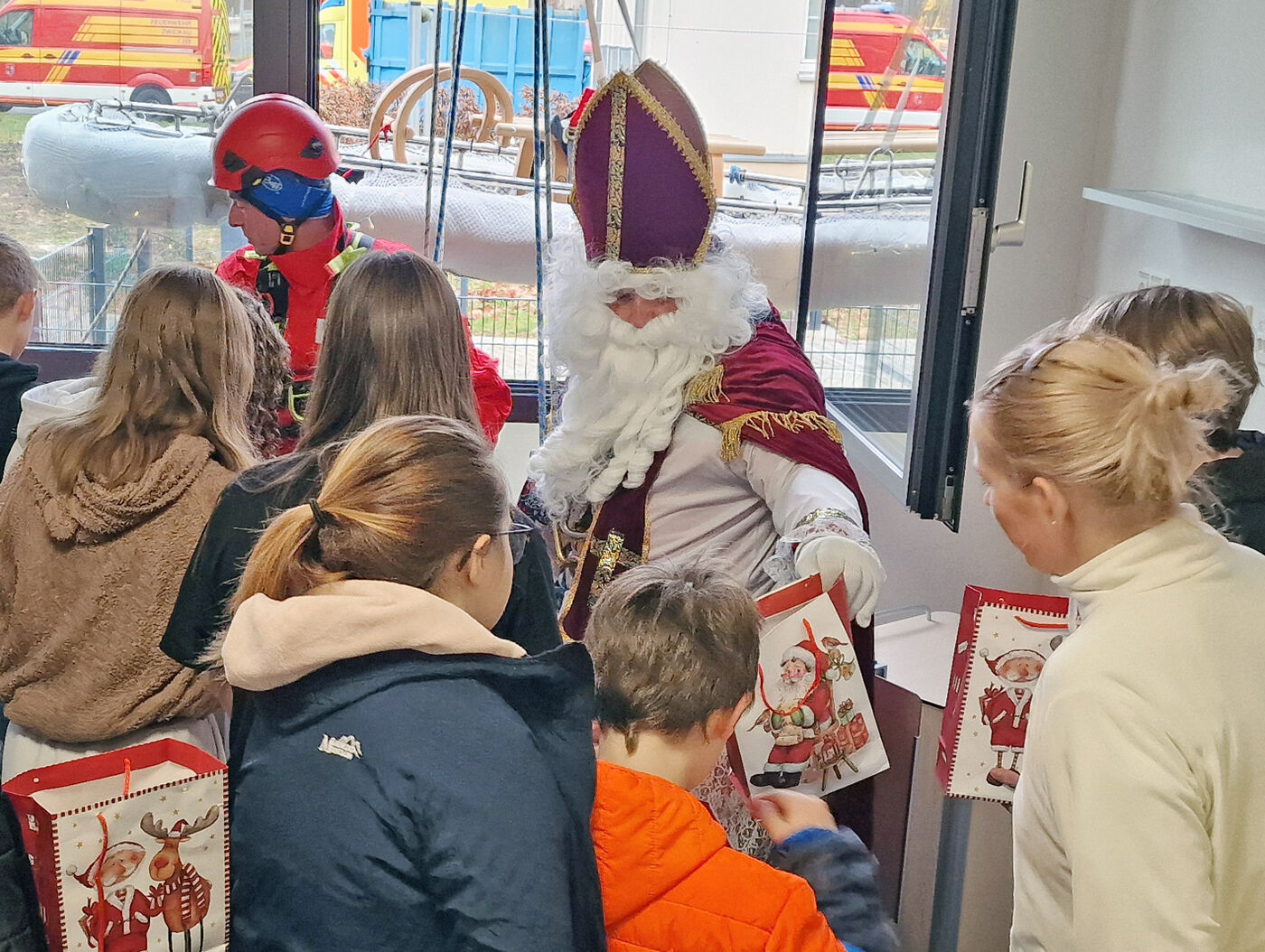 Eine spektakuläre und herzerwärmende Überraschung haben die kleinen Patienten des HBK-Kinderzentrums am heutigen Nikolaustag erlebt: Die Höhenretter der Berufsfeuerwehr Zwickau rückten mit dem Drehleiterfahrzeug an. Einer der Kameraden seilte sich verkleidet als Nikolaus aus 15 Metern Höhe vom Krankenhausdach ab. Er klopfte direkt an die Fensterscheiben des Kinderzentrums und reichte durch die geöffneten Fenster kleine Geschenke an die rund 50 Kinder und Jugendlichen. Gesponsert wurden die Präsente von der Zwickauer Energieversorgung und der Zwickauer Sparkasse.