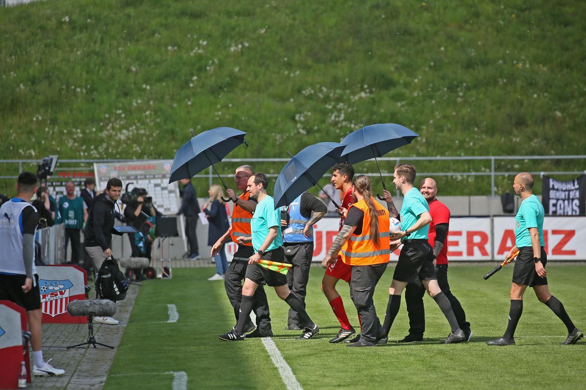 - Nach der Bierdusche vor zwei Wochen wurden die Schiedsrichter diesmal mit Schirmen vor Übergriffen geschützt.