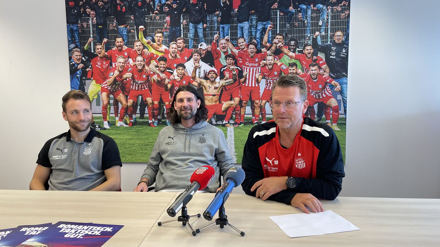 - Mike Könnecke (v.li.), Robin Lenk und Rico Schmitt beim Pressegespräch vor dem Ostderby gegen Erfurt