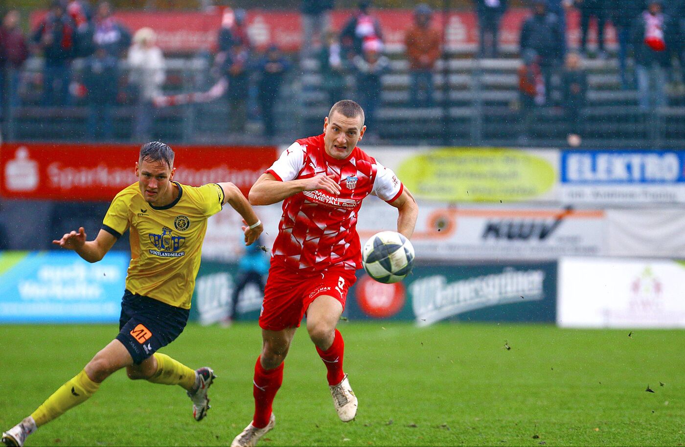 - Jonas Dittrich von Auerbach im Zweikampf mit dem Zwickauer Lucas Albert.