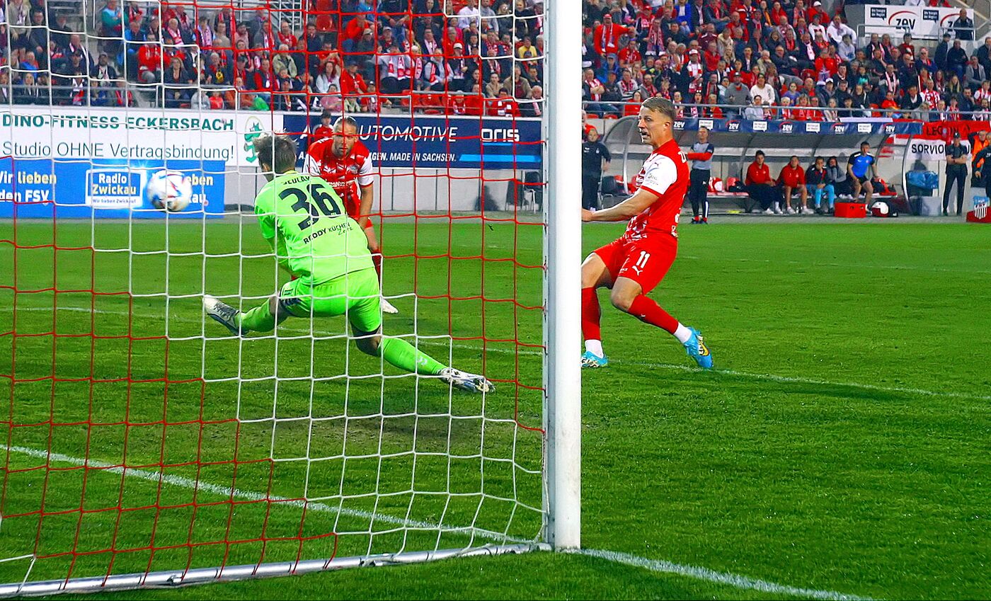 Und die Thüringer beeindruckte auch die Zwickauer Führung nicht. Sie scheiterten ein paarmal an der FSV-Abwehr oder an sich selbst. Doch in der 70. Minute knallte René Eckert den Ball nach einer Flanke von rechts unter die Latte. Anschließend war Meuselwitz näher am Siegtreffer als Zwickau. Michael Ulrich traf in der 79. Minute die Latte. Auch die Rotweißen gaben alles, um doch noch den Sieg einzufahren, und René Rüther hatte das 2:1 in der Nachspielzeit auf dem Fuß, scheiterte aber am Torwart.