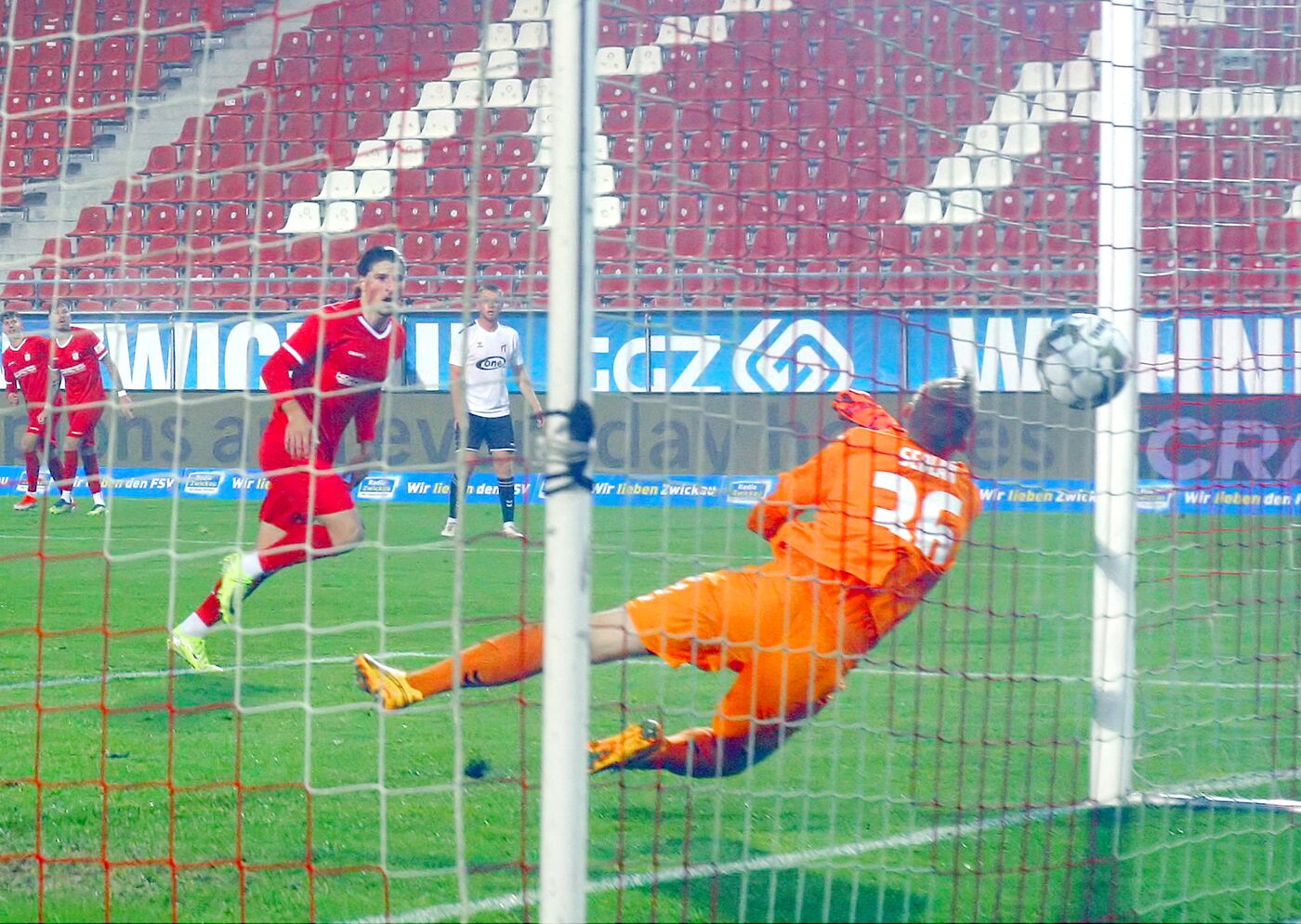 Einige der 3.890 Zuschauer hatten noch gar nicht Platz genommen, da lag der FSV schon zurück. Zwickau verlor nahe der Mittellinie den Ball, Meuselwitz kam über zwei, drei Stationen vors Tor und Florian Hansch schob den Ball am Keeper vorbei ins lange Eck – geschehen in der 5. Minute.