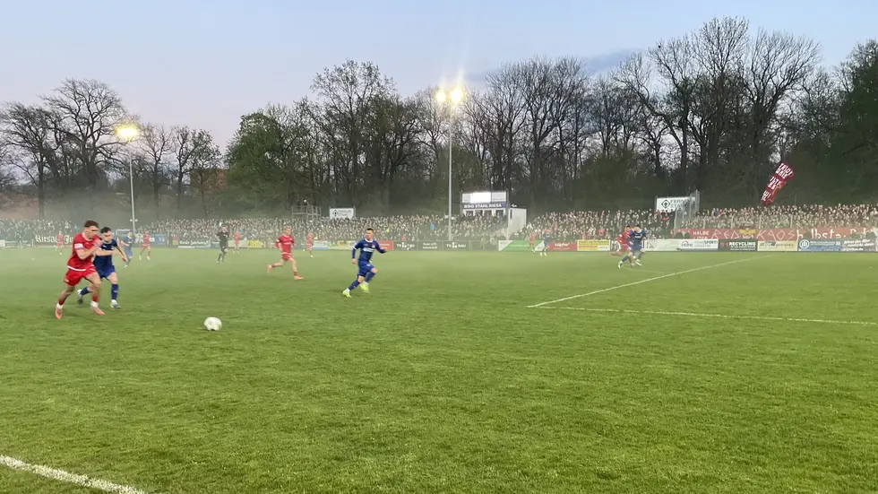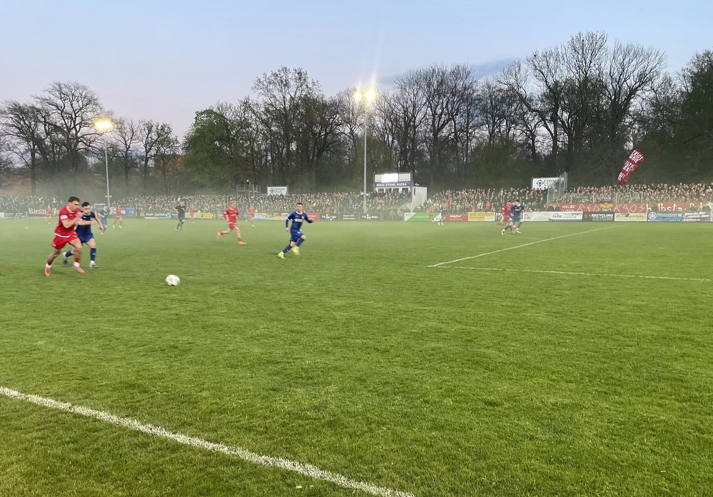Die Schwäne begannen druckvoll vor vollen Rängen in der Feralpi-Arena. Riesa verteidigte mutig und aggressiv, kam aber kaum zu Entlastung. In der 19. Minute prüfte Lennert Möbius Riesas Keeper Christopher Hauswald erstmals aus acht Metern. In der 23. Minute fiel die Führung: Veron Dobruna flankte von links. Im Fünfmeterraum war Cemal Sezer cleverer als Dennis Leonhardt und köpfte aus vier Metern problemlos ein. Kurz vor der Pause hatte Vladyslav Skala die beste Riesaer Chance – er zielte im Fallen nur haarscharf vorbei.