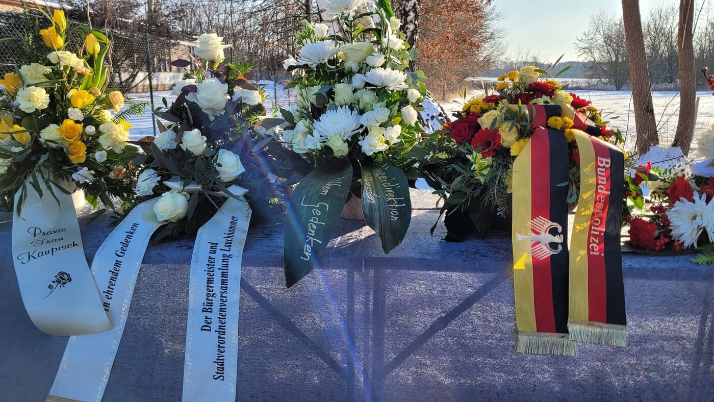 Mit einer Schweigeminute ist am Dienstag an den vor einem Jahr in Lauchhammer getöteten Polizisten aus Sachsen erinnert worden. Um 11.24 Uhr nahmen Kollegen  am Tatort an der Bockwitzer Straße ihre Mützen ab. Polizisten in Sachsen unterbrachen ihre Arbeit und hielten inne. Die Ministerpräsidenten von Sachsen und Brandenburg, Kretschmer und Woidke, legten Gestecke nieder.
