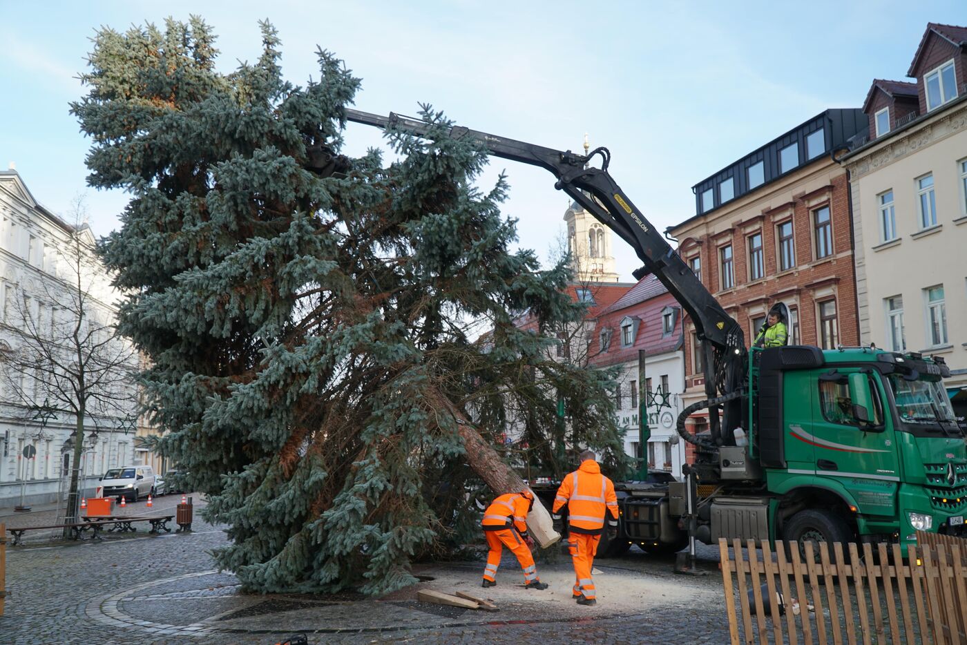 Der Weihnachtsbaum auf dem Werdauer Marktplatz steht! Am Dienstagvormittag wurde eine rund 14 Meter hohe Blaufichte aufgestellt. Der Baum stammt aus Langenhessen und ist eine Spende von Herrn Huferichter.