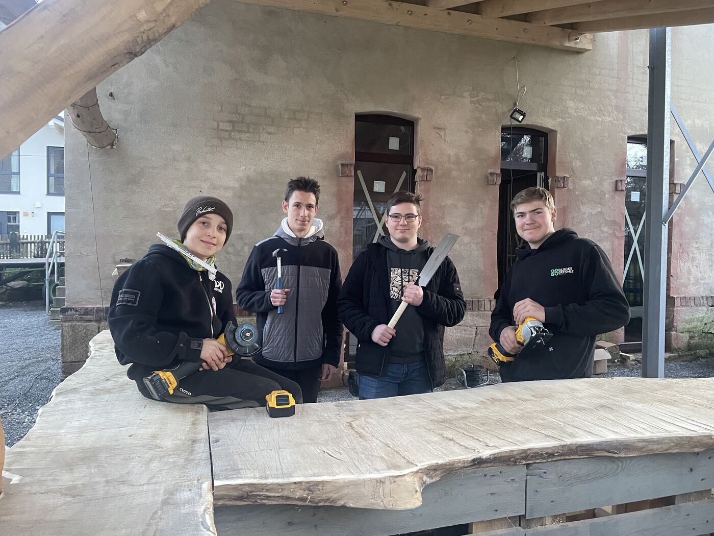 - Wenzel, Lars, Jonas und Max packten am Mittwoch mit zu (v.l.n.r.) - sie befinden sich im Außenbereich der Werkstatt.