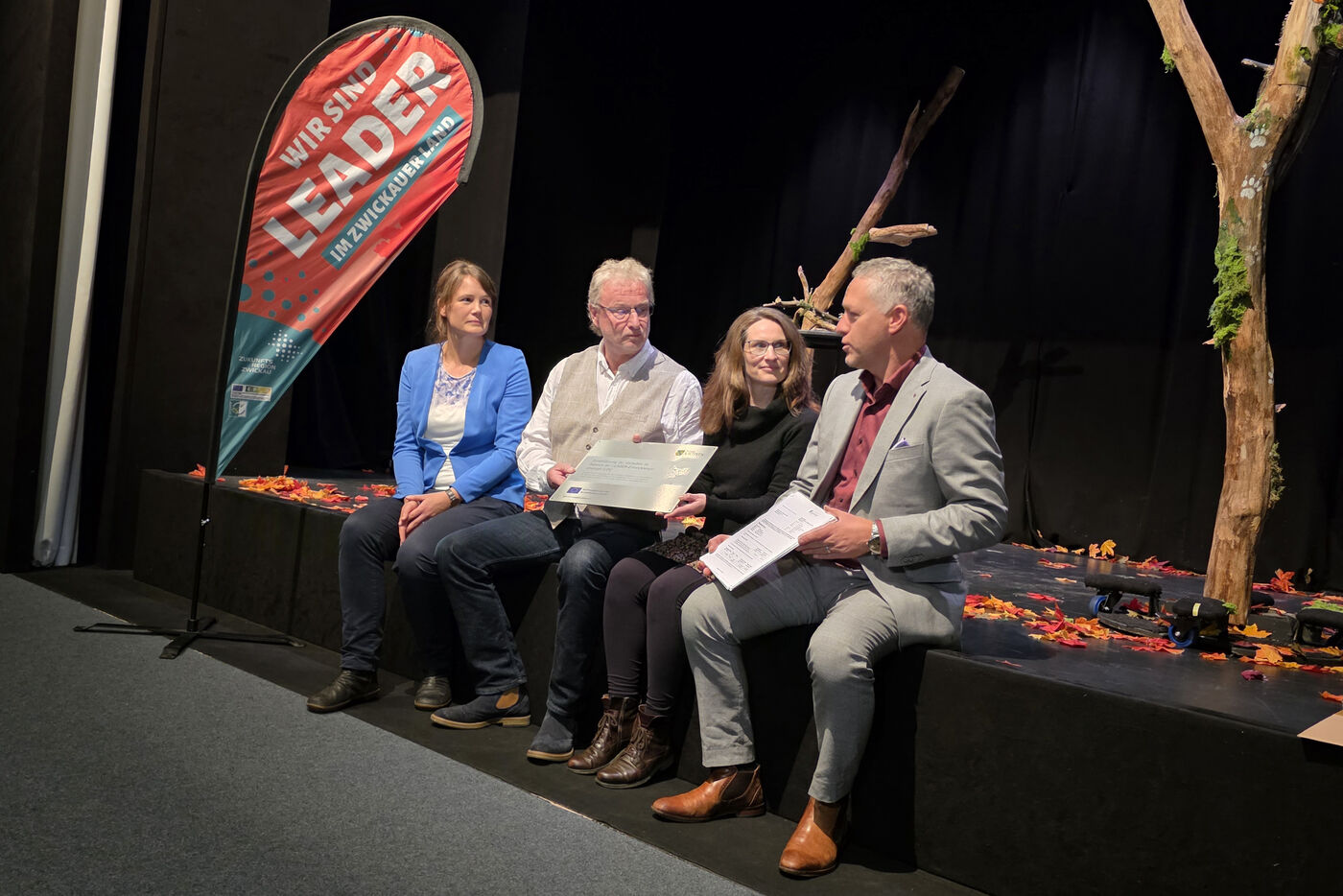 - Landrat Carsten Michaelis mit dem Förderbescheid, neben ihm Direktorin Christine Schmidle, Kultour-Z-Chef Jürgen Flemming und Isabel Schauer, Regionalmanagerin der Zukunftsregion Zwickau (von links nach rechts)