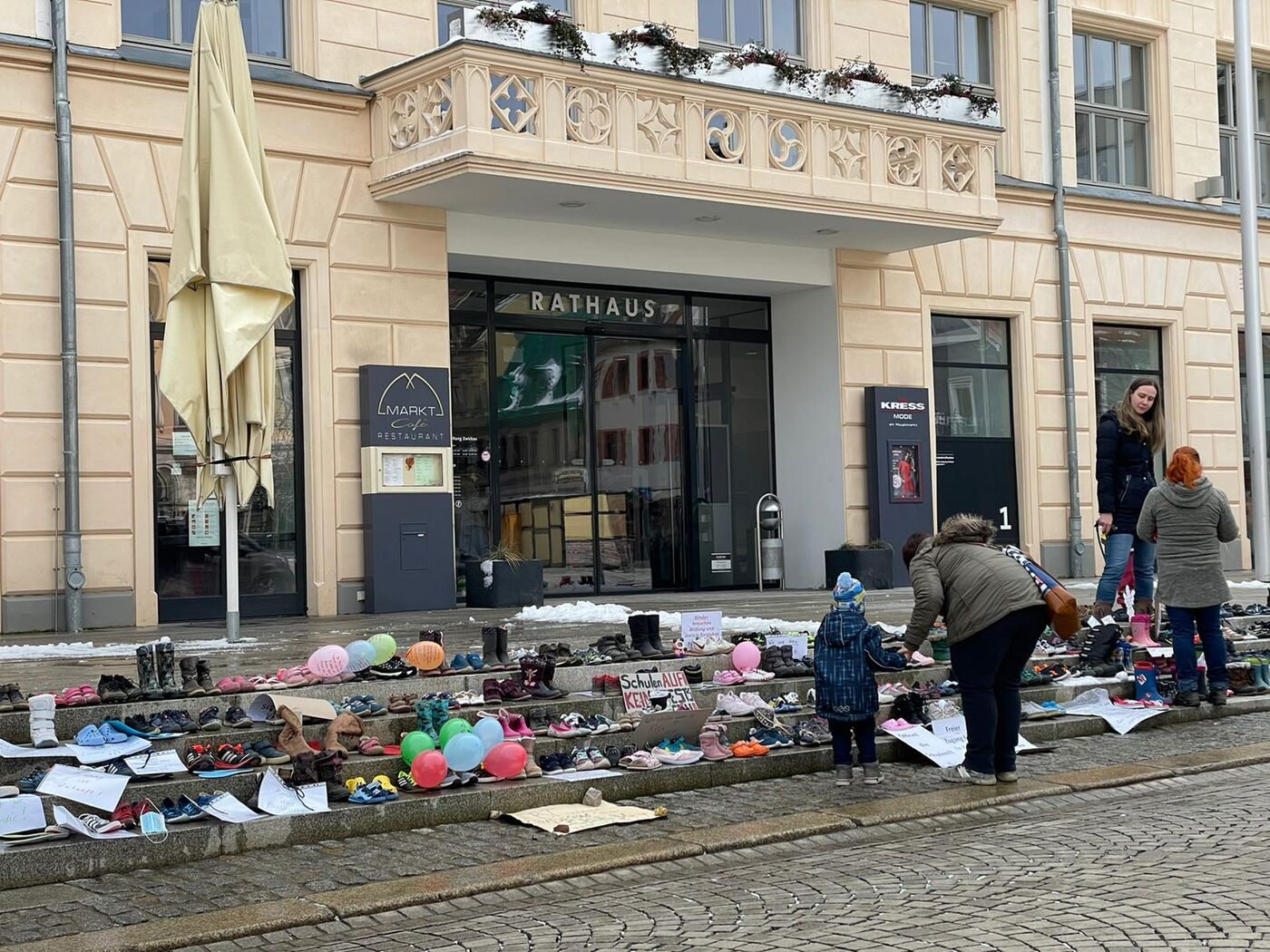Zu dem Protest aufgerufen hatte eine private Initiative in den sozialen Medien. Sprecherin Yvonne Drechsel sagte uns: „Wir wollen den Kindern eine Stimme geben. Sie haben ein Recht auf Bildung, und sie leiden extrem unter der Situation.“ Auch in Limbach-Oberfrohna und in mehreren Städten im Erzgebirge wurden Kinderschuhe vor die Rathäuser gestellt.