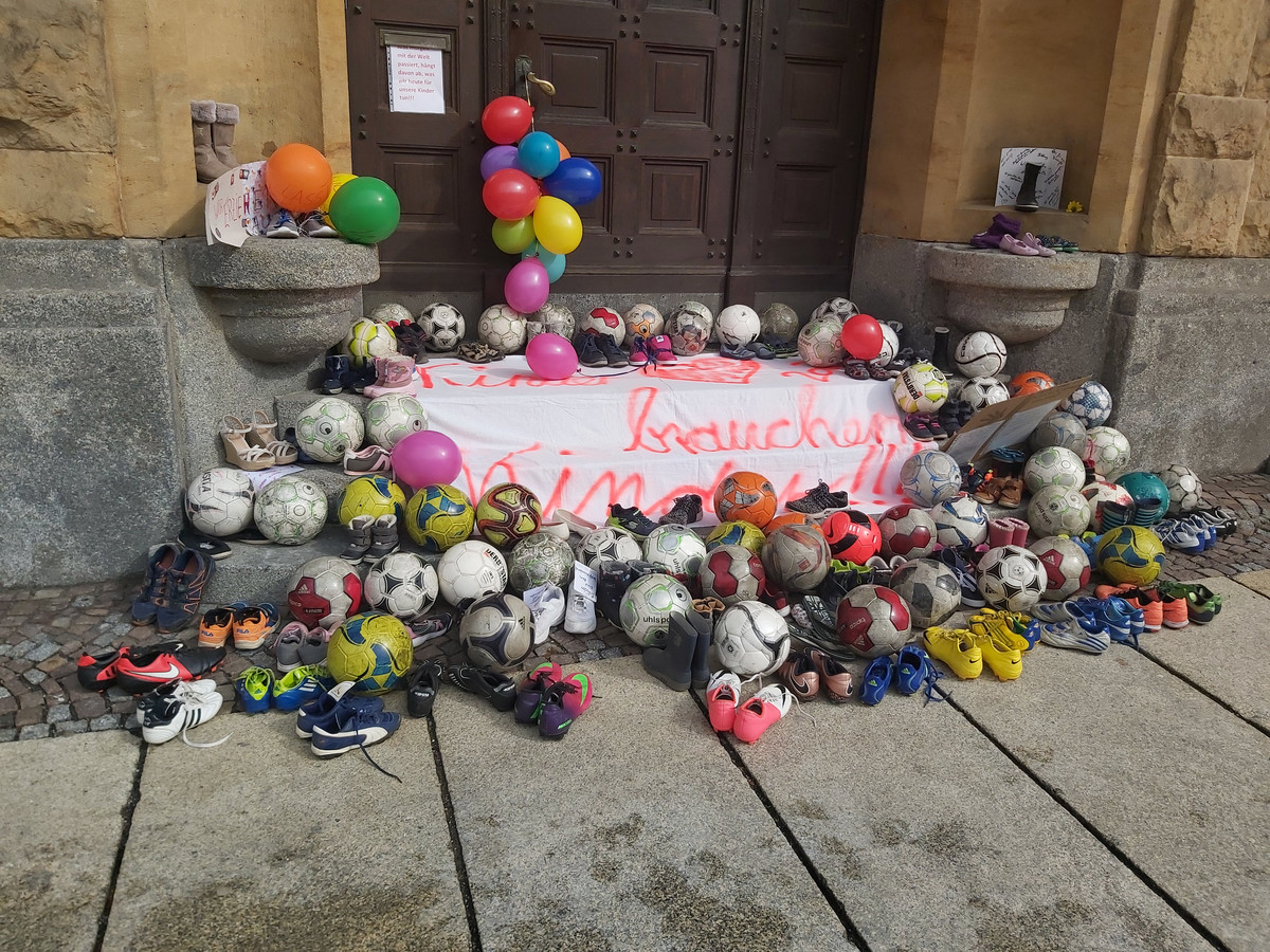 Update 22.02.21 - Auch vor dem Werdauer Rathaus gab es Proteste, organisiert vom FC Sachsen 90 Werdau. Unter dem Motto „Die Luft ist raus“ wurden dort ausgediente Fußballschuhe und Fußbälle platziert. Die Mädchen und Jungen des Vereins hatten im Oktober ihre letzte Trainingseinheit.