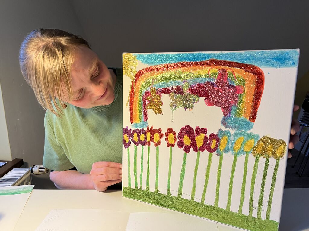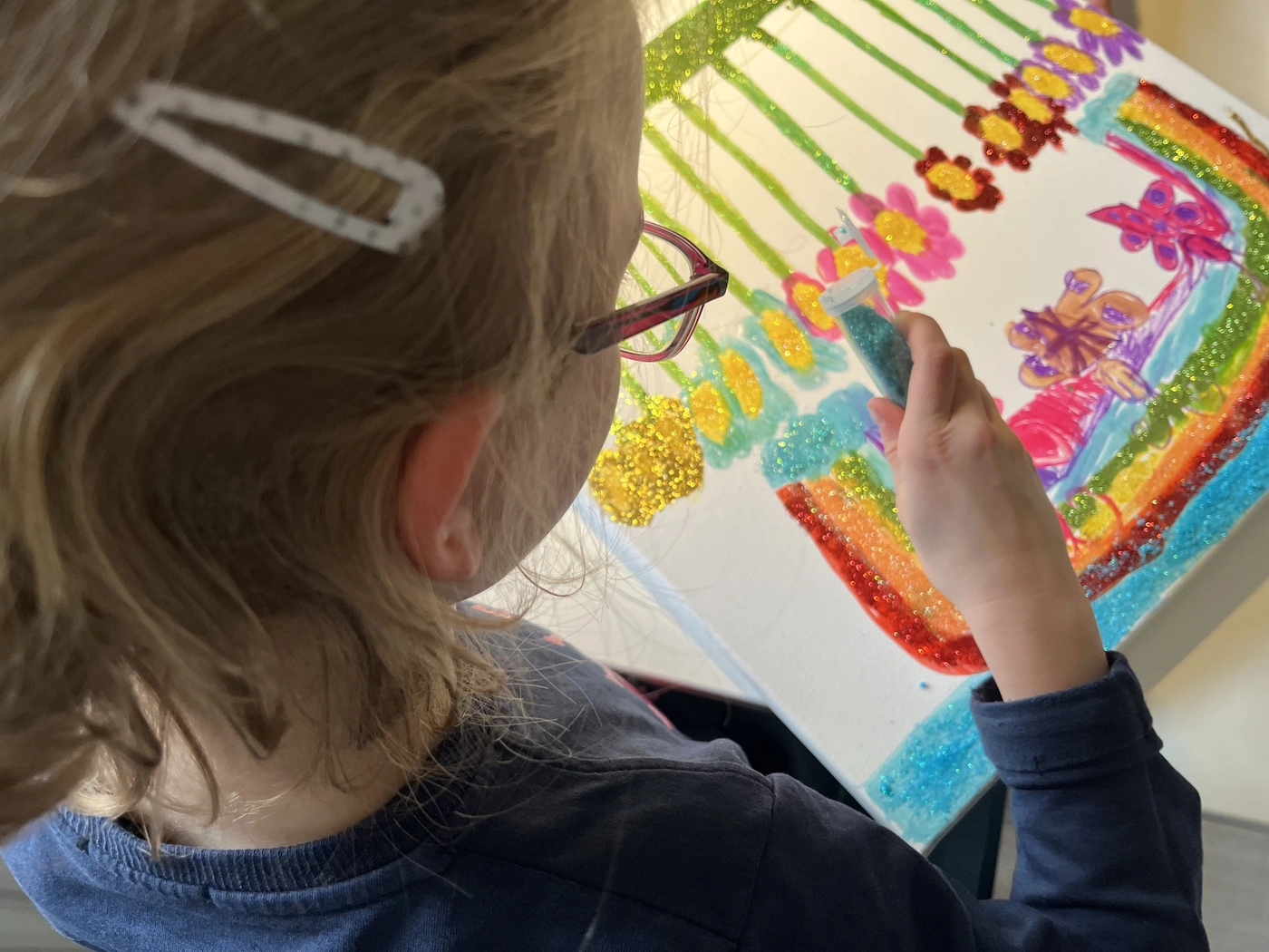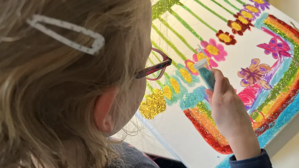 Glitzerschmetterlinge, Blumen und ein bunter Regenbogen - das neunjährige Mädchen strahlt.