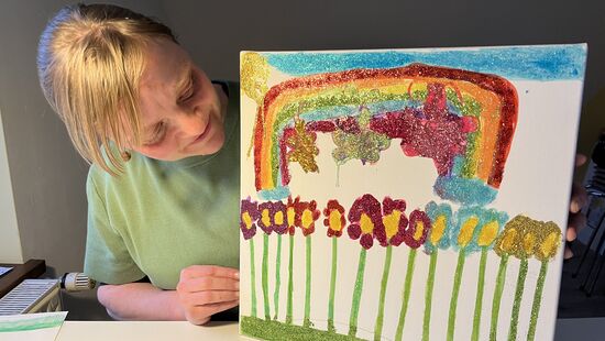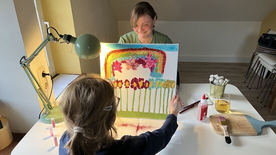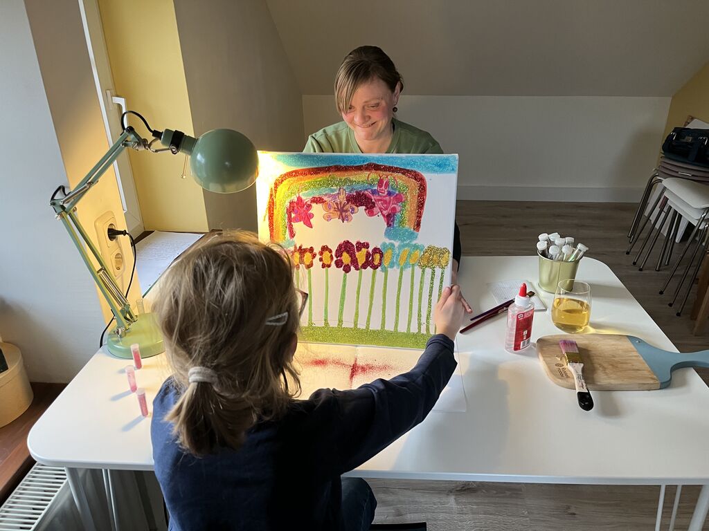 Die Kleine plappert munter drauf los: „Der Regenbogen führt zu einem Goldschatz. Als ich traurig war, hab ich den Regen gemalt, ohne Regenbogen.“ erzählt sie. Cordula Schild ist tiefenpsychologische Kunsttherapeutin und bestärkt das Mädchen. „Wir müssen nicht für alles Worte finden. Viele Gefühlslagen sind noch zu präsent und die Kinder auch noch viel zu klein. Bei der künstlerischen Arbeit mit verschiedenen Materialien, Farben und Werkzeugen werden Gefühle sichtbar und können besser verarbeitet werden.“