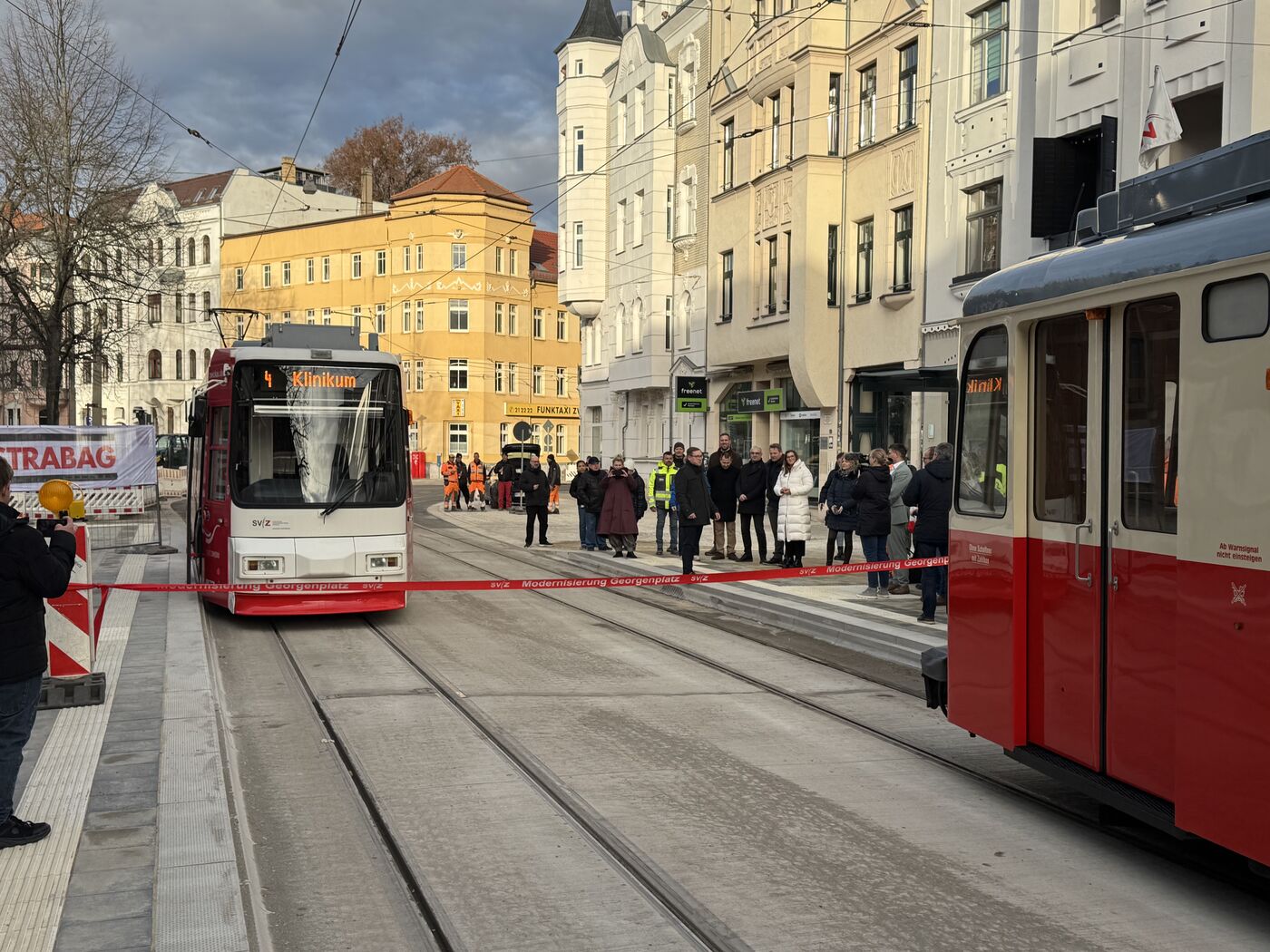 - Zur Freigabe der Strecke haben sich zwei Bahnen der SVZ an der neuen Georgenplatz-Haltestelle getroffen.