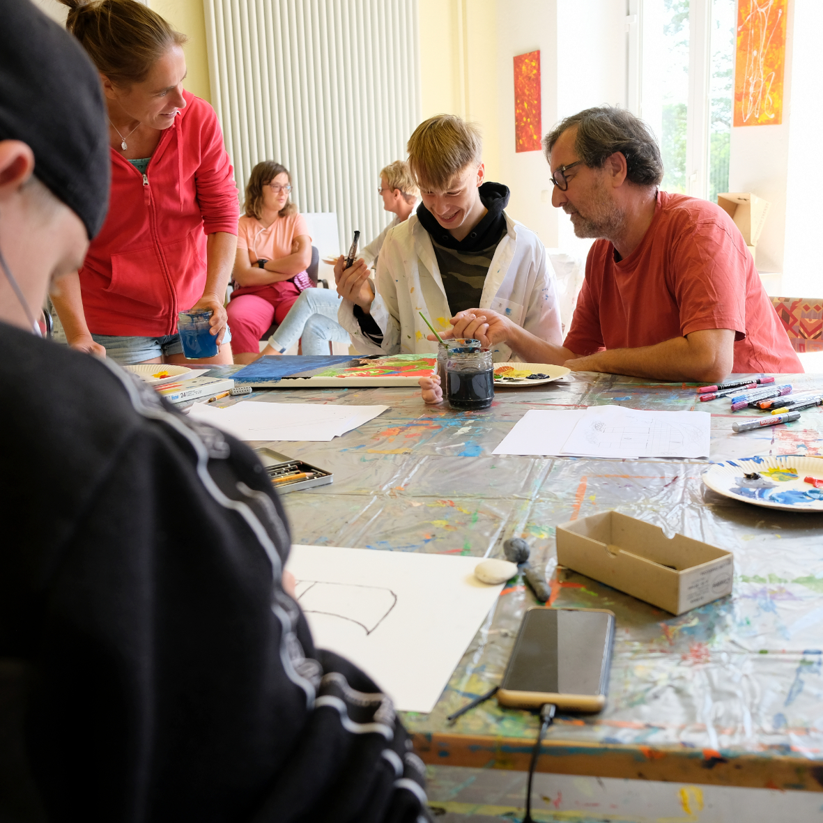 "Man kann hier einfach malen, was einem in den Sinn kommt", schwärmt Lion von dem Ferienangebot. Während ihn die Titanic fesselt, hat zum Beispiel der 13-jährige Jonas sein Gehirn auf der Leinwand festgehalten. Ein Star-Wars-Gefährt ist darin ebenso zu finden wie das Auge aus seinem Lieblingsfilm, aber auch eine Tür mit der Aufschrift "Nicht öffnen!" Maria aus dem Integrativen Familienwohnen dagegen hat ein abstraktes Bild geschaffen. "Ich schaue einfach, was auf der Leinwand entsteht, und lass mich von meinem Bild überraschen", sagt sie.