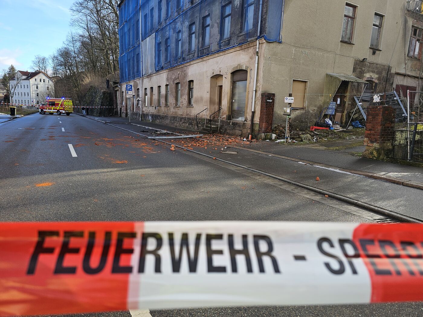 Derzeit versuchen Feuerwehrleute über die Drehleiter zwei Personen aus dem akut einsturzgefährdeten Gebäude zu retten. Polizei und Krankenwagen sind ebenfalls vor Ort. Die Kirchberger Straße ist bis auf weiteres voll gesperrt. Wie es zu dem Unglück kommen konnte, ist bislang noch unklar.