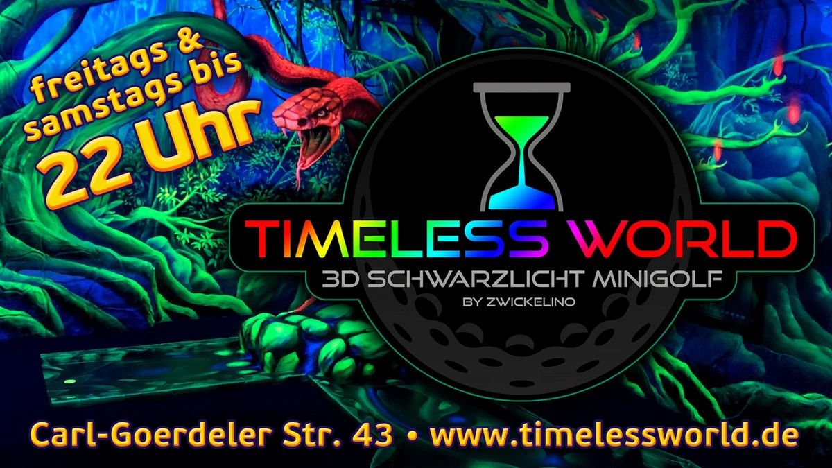 Die Timeless World ist eine 3D Schwarzlicht Minigolfanlage. Mit viel Liebe zum Detail haben die Macher des Zwickauer Indoorspielplatzes Zwickelino ein Erlebnis geschaffen, dass dazu einlädt, einfach mal die Zeit zu vergessen. Taucht ein in eine Welt aus Farben, Formen und Bildern, in der allein deine Phantasie der Regisseur ist.