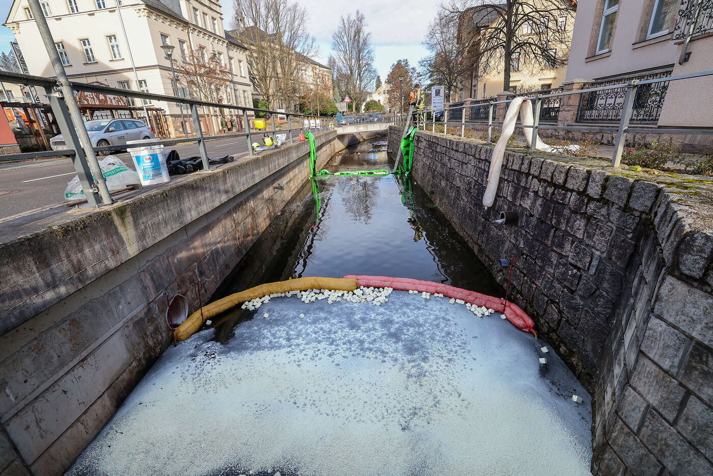 Die Einsatzkräfte bauten eine Ölsperre auf dem Bach auf und verteilten Bindemittel und saugfähige Würfel. Zur Ursache ermitteln Feuerwehr und Polizei.