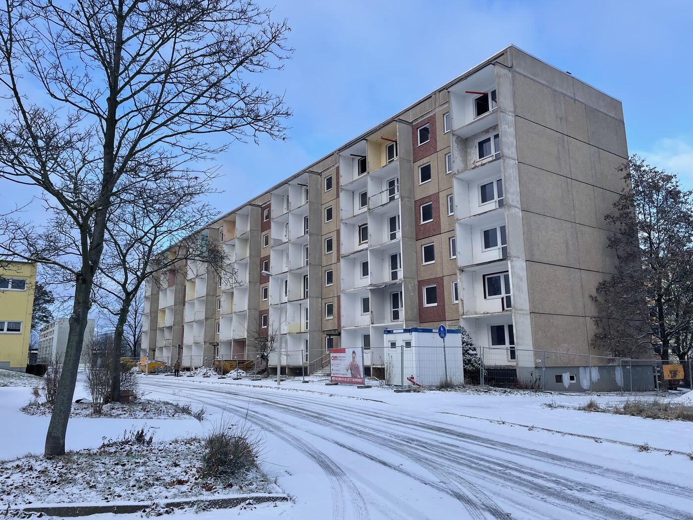 Das Projekt trägt den Namen „Sonnenpanorama“ und sieht vor, dass aus den 72 Wohnungen aus DDR-Zeiten 72 moderne Eigentumswohnungen werden – unter anderem mit Fußbodenheizung, zwei Balkonen und Aufzug. Die Verkaufsphase habe begonnen, teilte uns die Firma Estador mit, die den Vertrieb in der Hand hat. Die umfangreichen Sanierungsarbeiten starten voraussichtlich Ende des Jahres.