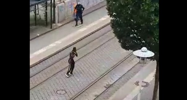 - Screenshot von Video, das in den sozialen Netzwerken kursiert: Der Mann aus Gambia in Boxer-Pose, oben im Bild ein Polizist.