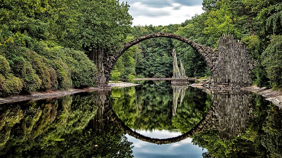 Die Rakotzbrücke ist ein beliebtes Fotomotiv der Lausitz. Das Ensemble war in den vergangenen zweieinhalb Jahren für mehr als vier Millionen Euro saniert worden. Die Basaltorgel wurde erneuert, die Grotte wiederaufgebaut, die Bogenbrücke saniert.