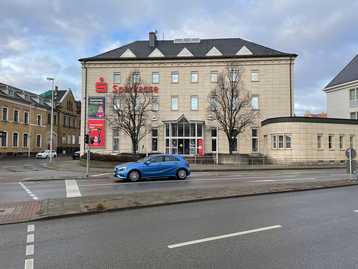 Crimmitschauer Straße 1 – das erste Haus an der Verkehrsader ist die Sparkasse. Demnächst verschwinden die roten Buchstaben. Bis Ende März muss die Sparkasse ausgezogen sein. Im April beginnt der Umbau zum Stadtarchiv. Das teilte uns die GGZ auf Nachfrage mit.