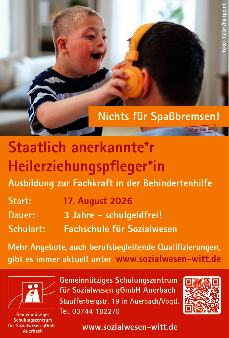 Im Gemeinnützigen Schulungszentrum für Sozialwesen in Auerbach startet am 17. August an der Fachschule für Sozialwesen die schulgeldfreie Ausbildung zu Heilerziehungspflegerinnen und Heilerziehungspflegern. Dieser Beruf eignet sich nicht nur für Sozialassistenten, sondern kann auch Quereinsteigern aus anderen Berufen eine neue Perspektive und eine erfüllende Arbeitsaufgabe bieten.