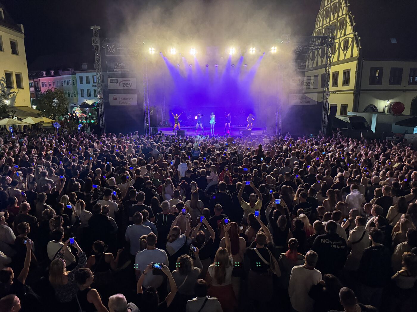 Für beste Partystimmung hatten zuvor auf dem Hauptmarkt unter anderem die beiden Newcomer gesorgt. Myle strahlte einfach Freude aus, jetzt in Zwickau zu sein und für die Menschen hier Musik zu machen, und die steckte an. Tom Twers verteilte Rosen und Charme, verließ auch mal die Bühne und spazierte singend durchs Publikum, brachte Handys zum Leuchten und Mädchen zum Kreischen, und er wünschte sich ein Wiedersehen in Zwickau, möglichst 2026.