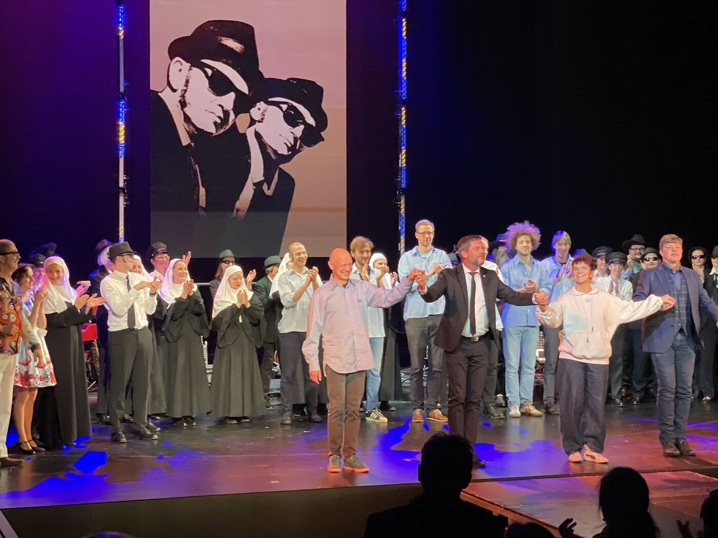 - Intendant und Regisseur Dirk Löschner (mit Krawatte) und das "Blues Brothers"-Ensemble freuen sich über den Applaus zur Premiere.