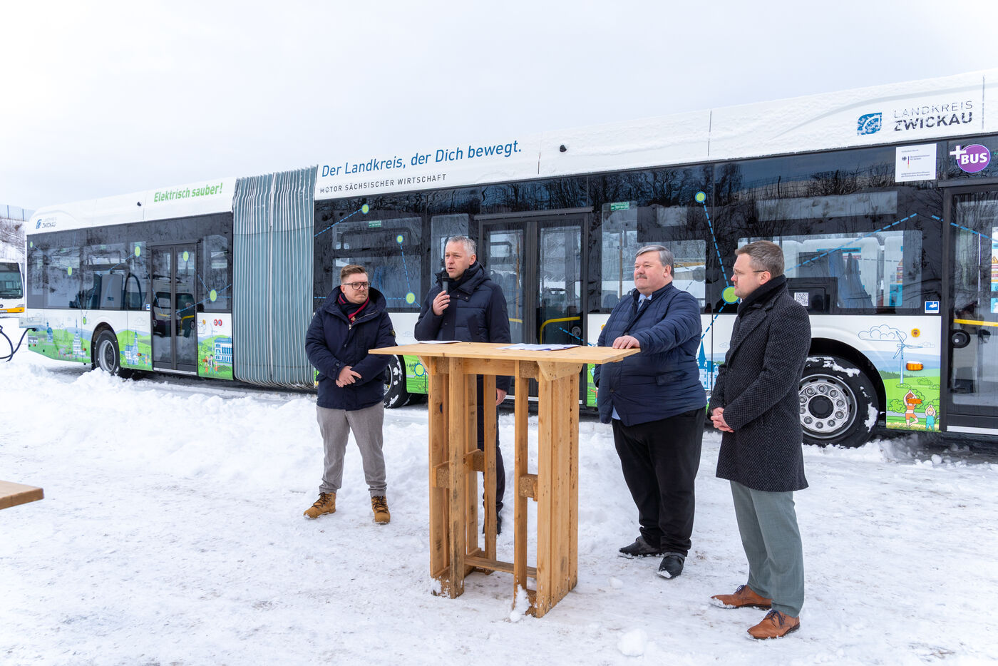 - Symbolischer Start für klimafreundliche Busse am Freitag in Werdau mit Oberbürgermeister Sören Kristensen, Denny Schädlich (Geschäftsführer Juno Solar), André Jalowy (Geschäftsführer Regionalverkehr Westsachsen) und Landrat Carsten Michaelis (v.l.n.r.)