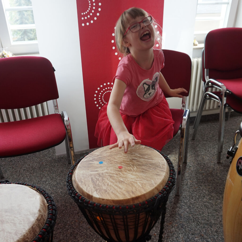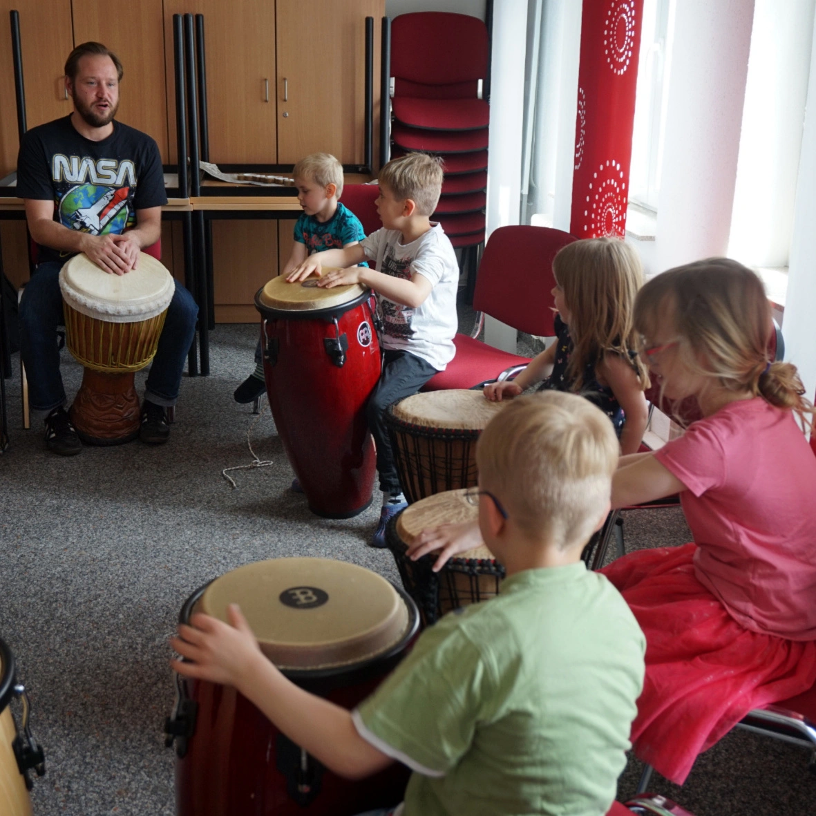 Am Dienstag, den 4. Juni, schwebten gegen Nachmittag rhythmische Klänge aus dem oberen Stockwerk des Kinder- und Jugendheimes in Burgstädt. Mal sanft und leise, mal laut und grob klangen die afrikanischen Trommeln. „Kongas“ und „Djembe“ nennen sich die Instrumente, die gespielt werden, erklärte uns Markus Barthold. Er spielt „Percussions“, ein Oberbegriff für Schlaginstrumente, seit mehr als 22 Jahren. Vor 15 Jahren gründete er eine Trommelschule, mittlerweile gibt er nur noch Workshops, leitet punktuell Gruppen an. Es ist ein Pilotprojekt in der Beethovenstraße, das wir aus Spenden der Radio Dresden Aktion „Herzenssache“ finanzieren und das bei genügend Anklang vielleicht bald öfter stattfindet.
