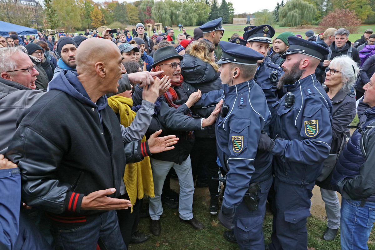 - Teilnehmer bedrängen Polizisten, als diese die Persponalien einer Störerin aufnehmen wollten. © Ralph Köhler/propicture