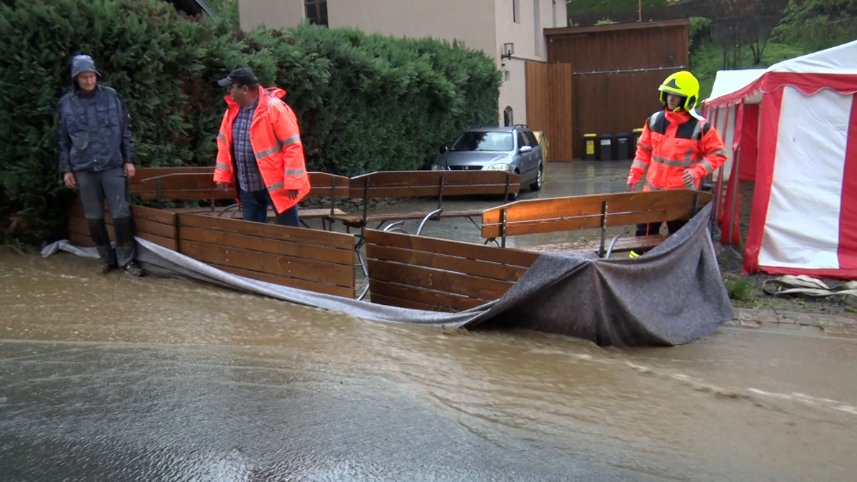 - Die Gaststätte in Weißbach wurde überflutet. Kameraden der Feuerwehr nutzten Bierbänke als Barriere.
