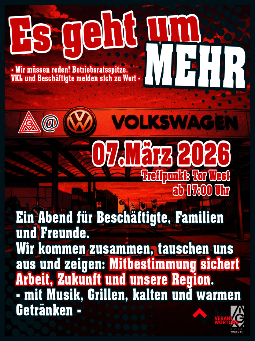 Unter dem Motto: „Es geht um mehr!“ wollen sich Betriebsräte und Vertrauensleute mit den VW-Werkern austauschen. „Nur im direkten Gespräch können wir Klarheit schaffen und zeigen, dass echte Mitbestimmung unsere Arbeit und unsere Zukunft sichert“, heißt es in dem Aufruf.