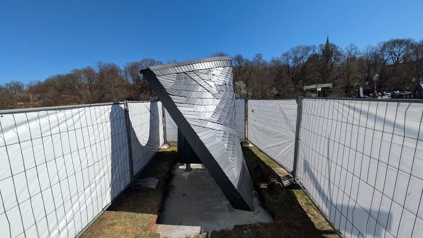 Der Zwickauer Beitrag ist am Donnerstag - noch hinter Sichtschutz verborgen - im Muldeparadies aufgestellt worden: eine Skulptur aus schwarzem Schiefer, erschaffen von der Künstlerin Jana Gunstheimer, einer gebürtigen Zwickauerin. Offiziell eingeweiht wird das Kunstwerk, das sich der Bergbaugeschichte widmet, am 13. April, 11 Uhr.