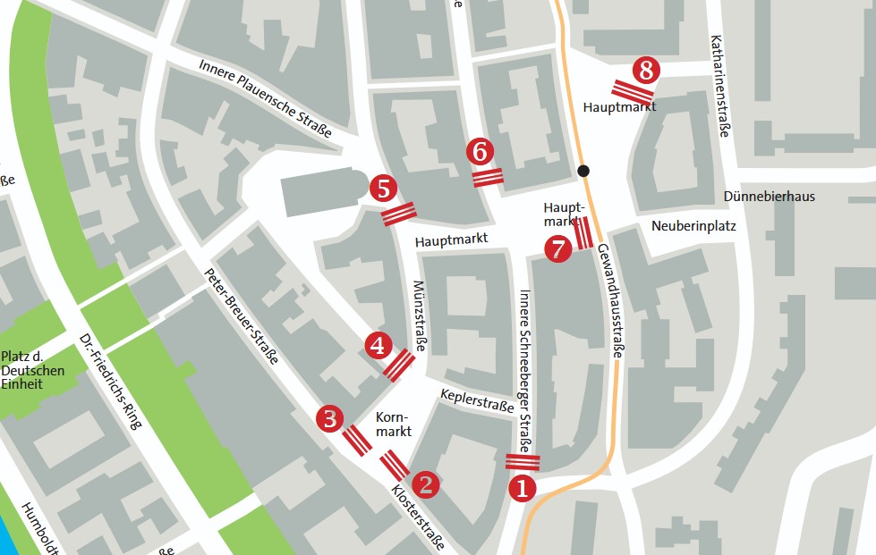 - Nachtzufahrt möglich (Mo–Fr/So ab 20:30 Uhr, Sa ab 21:30 Uhr bis 10:30 Uhr) ist unter anderem an der Inneren Schneeberger Straße (nach Haltestelle Zentrum), am Kornmarkt (beim Jacob-Leopold-Bau), in der Hauptstraße (Höhe Hauptstr. 7) und am Hauptmarkt (Zugang aus Richtung Straßenbahn/Gewandhaus).