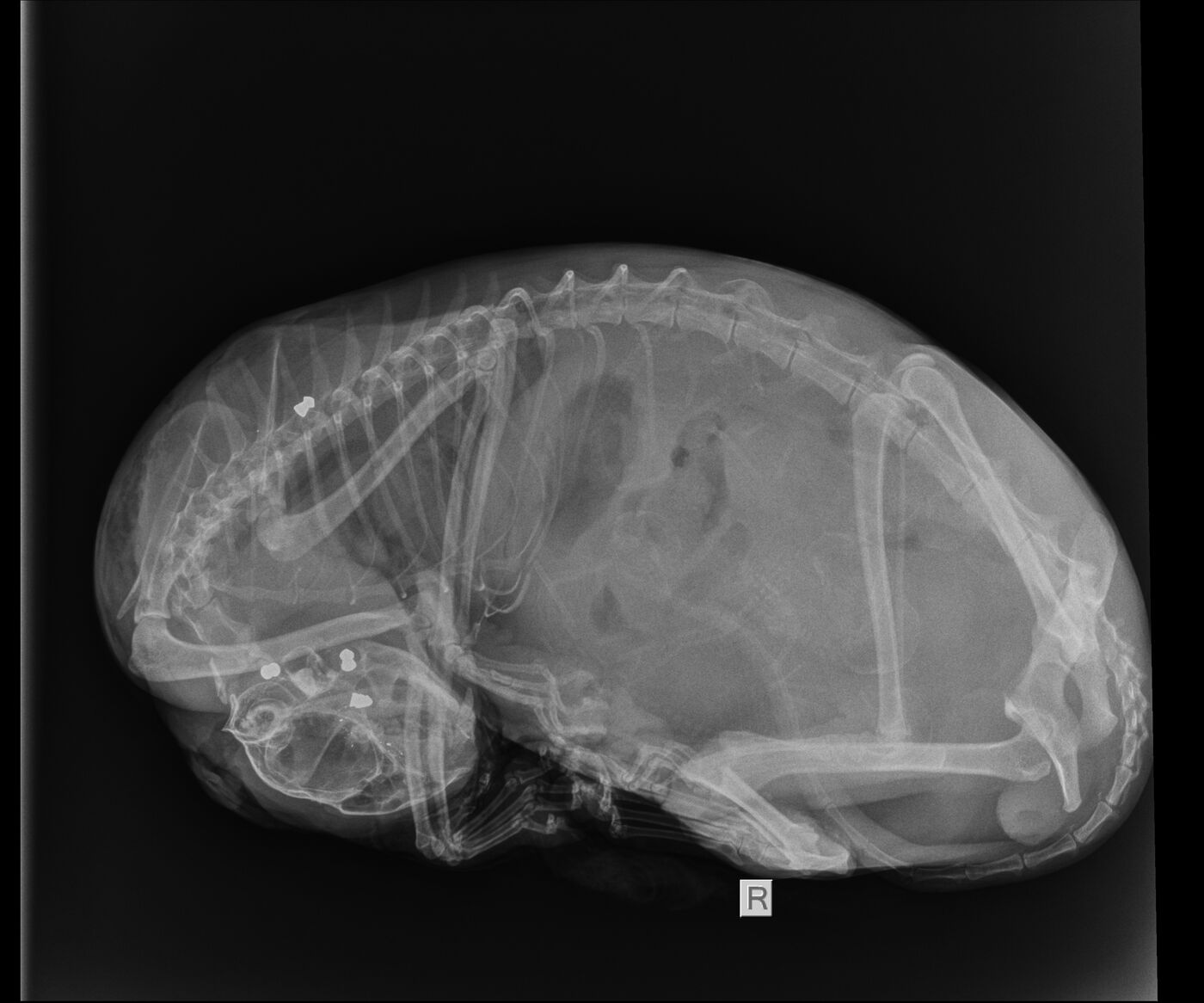 - Auf dem Röntgenbild sind insgesamt vier Projektile zu sehen, drei davon im Kopf der Katze.