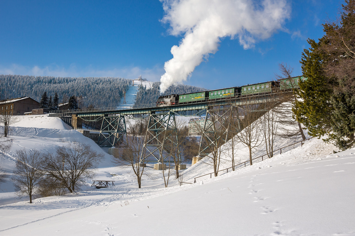 Wie wärs denn mal mit einer Fahrt mit der Fichtelbergbahn? Die fährt von Cranzahl nach Oberwiesenthal. Die Schmalspurbahn zieht Eisenbahnfans, Familien und Urlauber in ihren Bann.